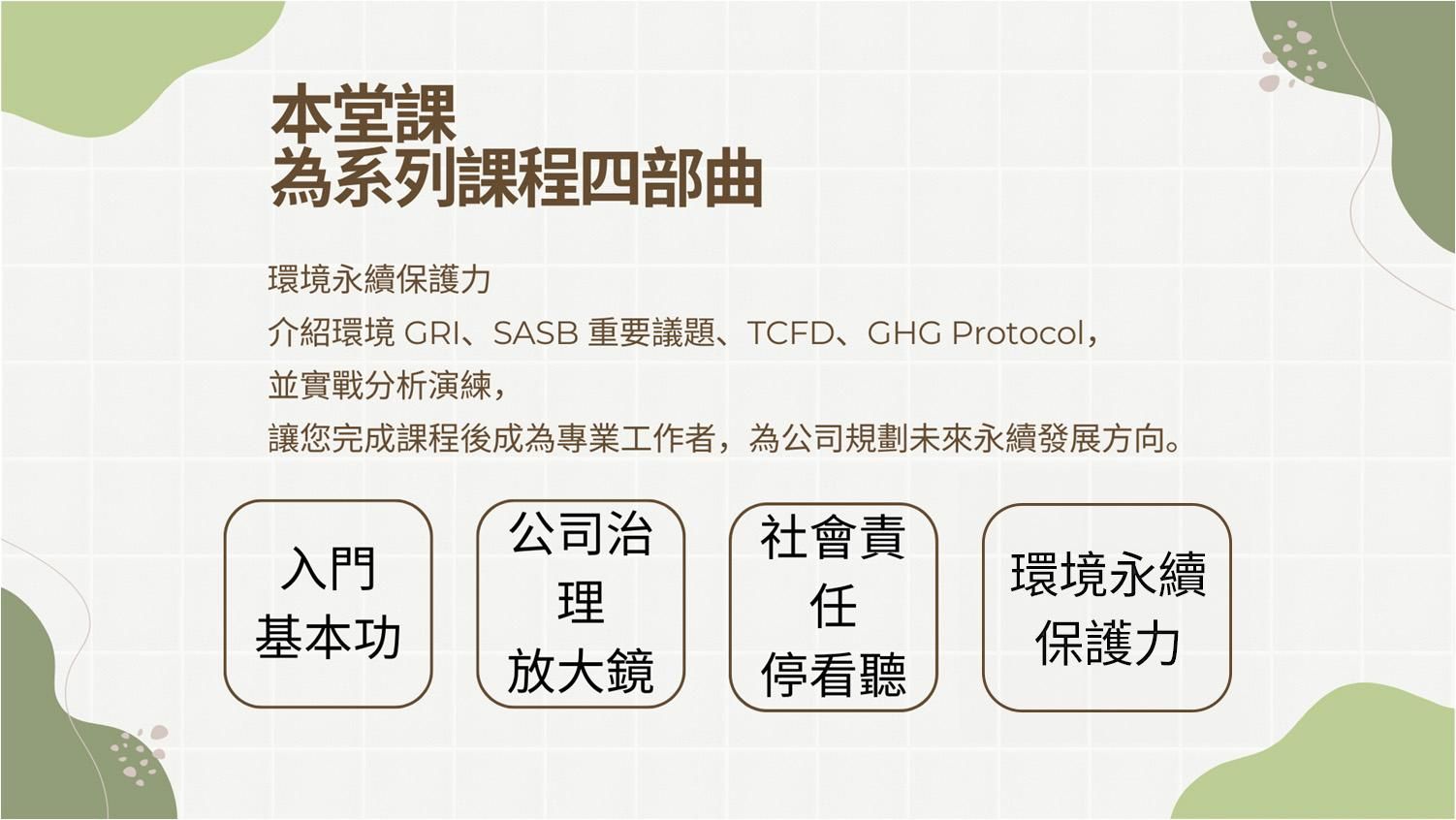 本系列《永續戰略執行力 - 從0到1精通ESG》一共有 4 部分。由淺入深,透過ESG專家的帶領,讓ESG不再只是抽象的概念,實際的指標、法規介紹與數據分析讓學生更能理解目前法規所看重的點與未來趨勢。