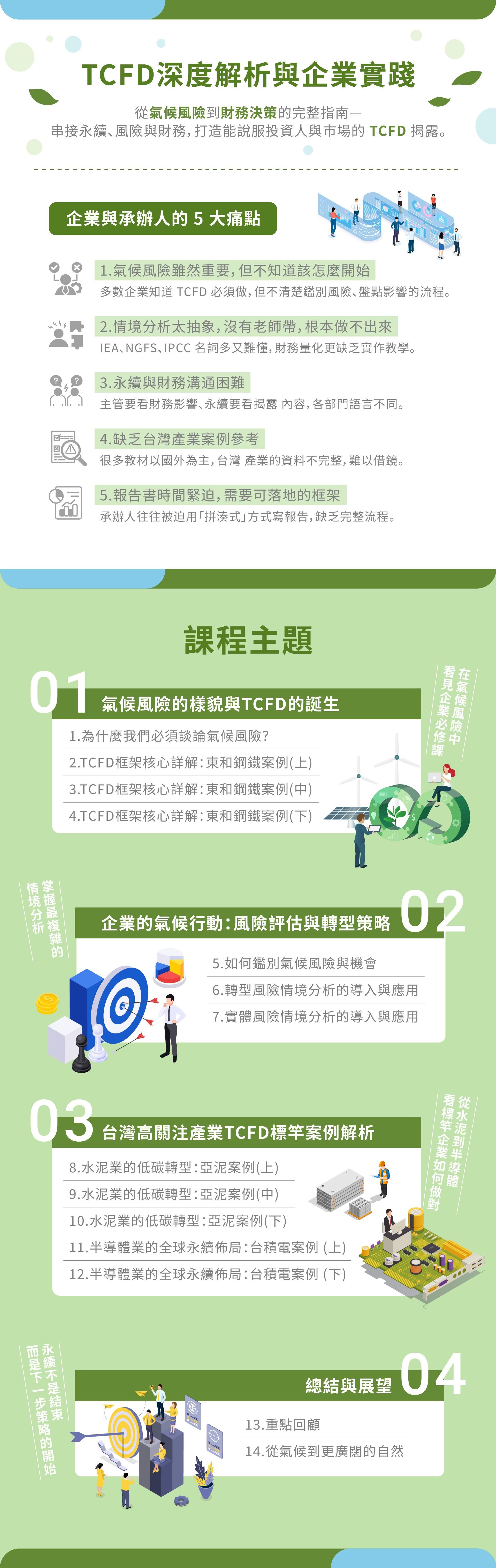 本課程以國際永續揭露框架 TCFD 為核心,整合企業風險管理、永續策略、財務影響評估與標竿案例解析,協助學員從基礎概念一路到能撰寫可落地的 TCFD 報告。