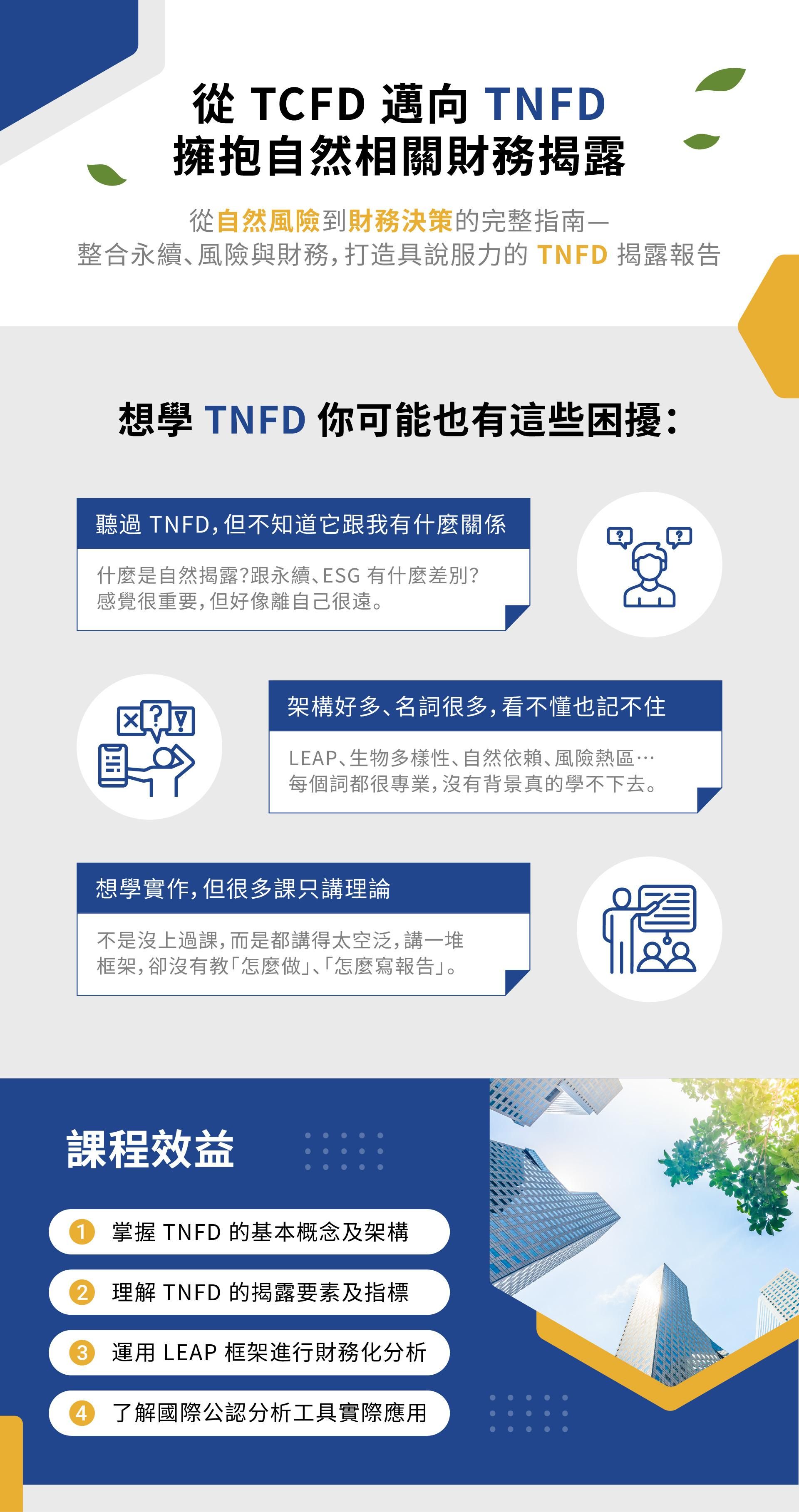 本課程聚焦於最新的國際永續揭露框架TNFD(自然相關財務揭露),從 TCFD 的基礎架構延伸至自然資本與生物多樣性的風險評估,協助企業掌握 TNFD 的實務應用與策略整合。透過理論、LEAP 方法論及案例解析,幫助學員從認識到能夠執行自然風險揭露報告。